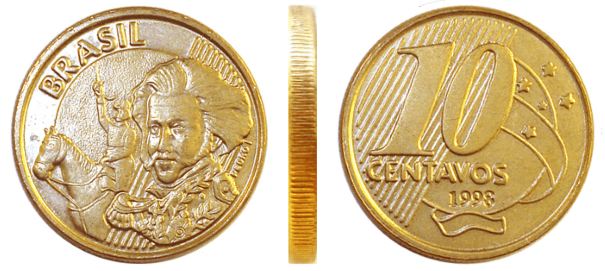 A primeira família de moedas do Real, lançada em 1994, foi produzida em grandes quantidades. Mesmo assim, a moeda de 10 centavos de 1998 acabou ganhando status de raridade porque parte da tiragem saiu da Casa da Moeda com um erro de alinhamento. Até 1998, o reverso apresentava o busto de Dom Pedro I em posição normal quando se girava a peça verticalmente. Nos lotes defeituosos, isso não acontece — o busto fica desalinhado, criando o chamado reverso horizontal ou rotated die.