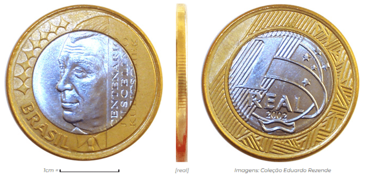 Para reconhecer uma moeda JK autêntica, observe os detalhes presentes no reverso: busto de Juscelino olhando para a esquerda, legenda “Centenário JK” e as datas “1902-2002”. Já o anverso mantém o padrão do 1 real de segunda família.