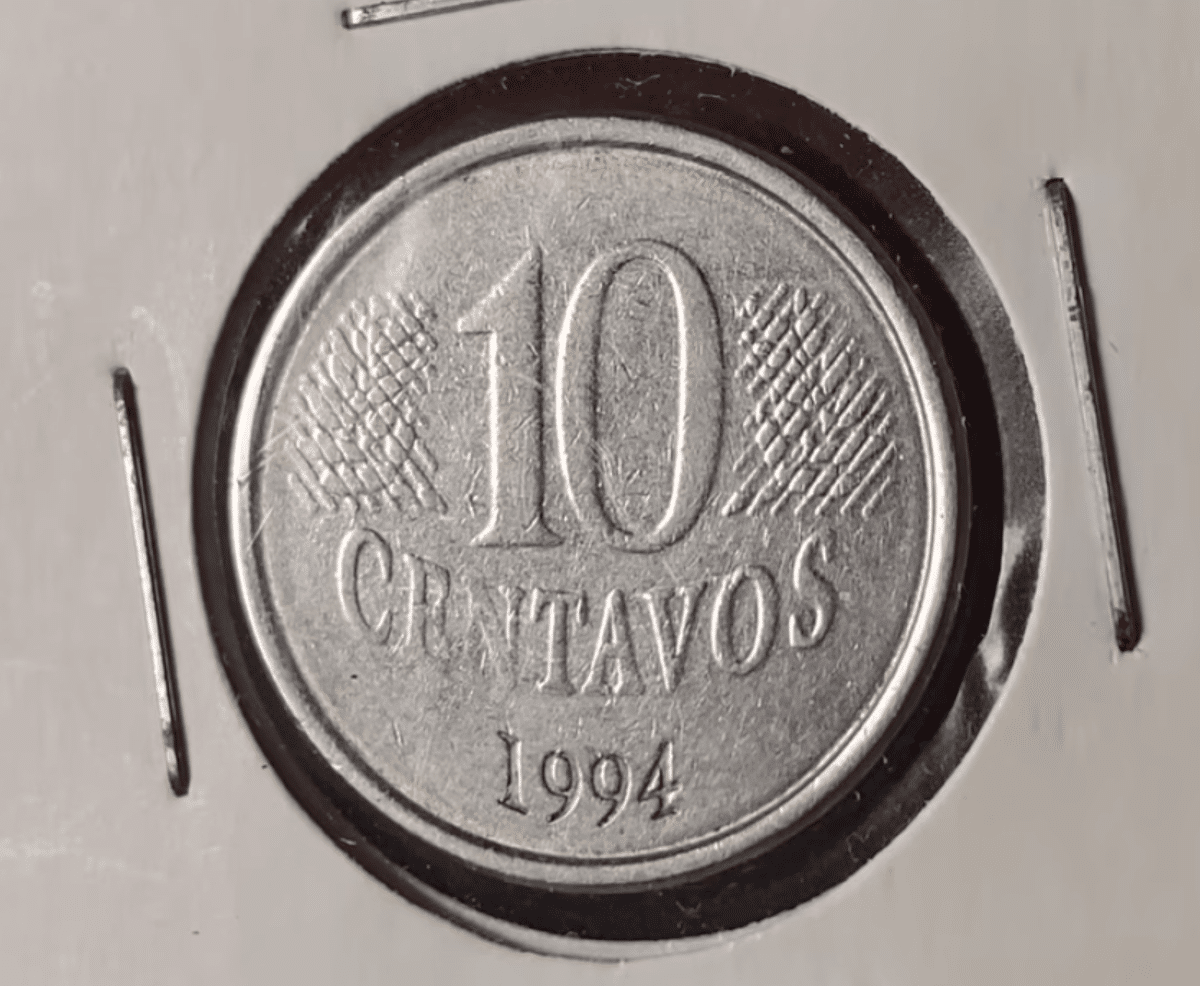 Em 1994, logo após a implantação do Real, a Casa da Moeda lançou as primeiras séries de moedas do novo padrão monetário. A tiragem do ano foi alta, mas uma pequena parte das peças de 10 centavos saiu da prensa com defeitos de alinhamento. Isso deu origem à moeda de 10 centavos rara que colecionadores procuram até hoje.
